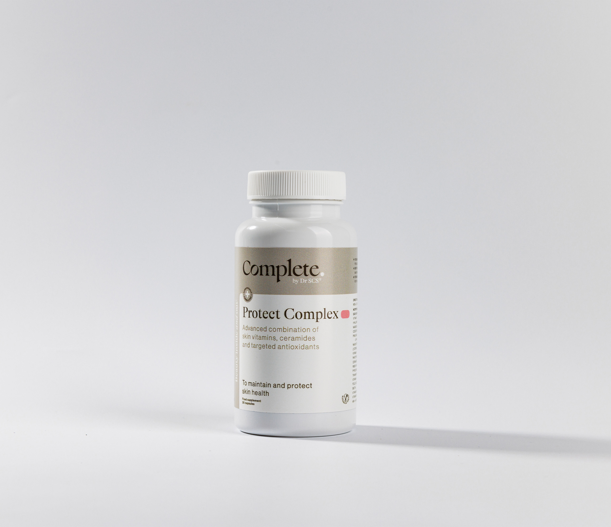 HPMC (capsule shell), Vitamin C, Hyaluronic acid, Magnesium oxide, Lycopene, Pine bark extract (Pinus pinaster), Coenzyme Q10, Rice bran ceramides (Oryza sativa), Vitamin E, Niacin (vitamin B3), Vitamin A, Pantothenic acid (vitamin B5), Vitamin D3 (algal), Pyridoxine hydrochloride (vitamin B6), Riboflavin (vitamin B2), Thiamine hydrochloride (vitamin B1), Methylcobalamin (vitamin B12), Folic acid (vitamin B9), Biotin (vitamin B7)
